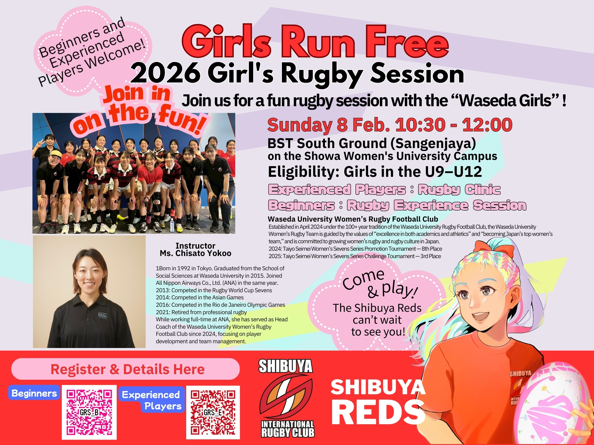 This event is open to both experienced players and beginners. Come and enjoy a unique opportunity to train, learn, and experience rugby together with the Waseda Girls!