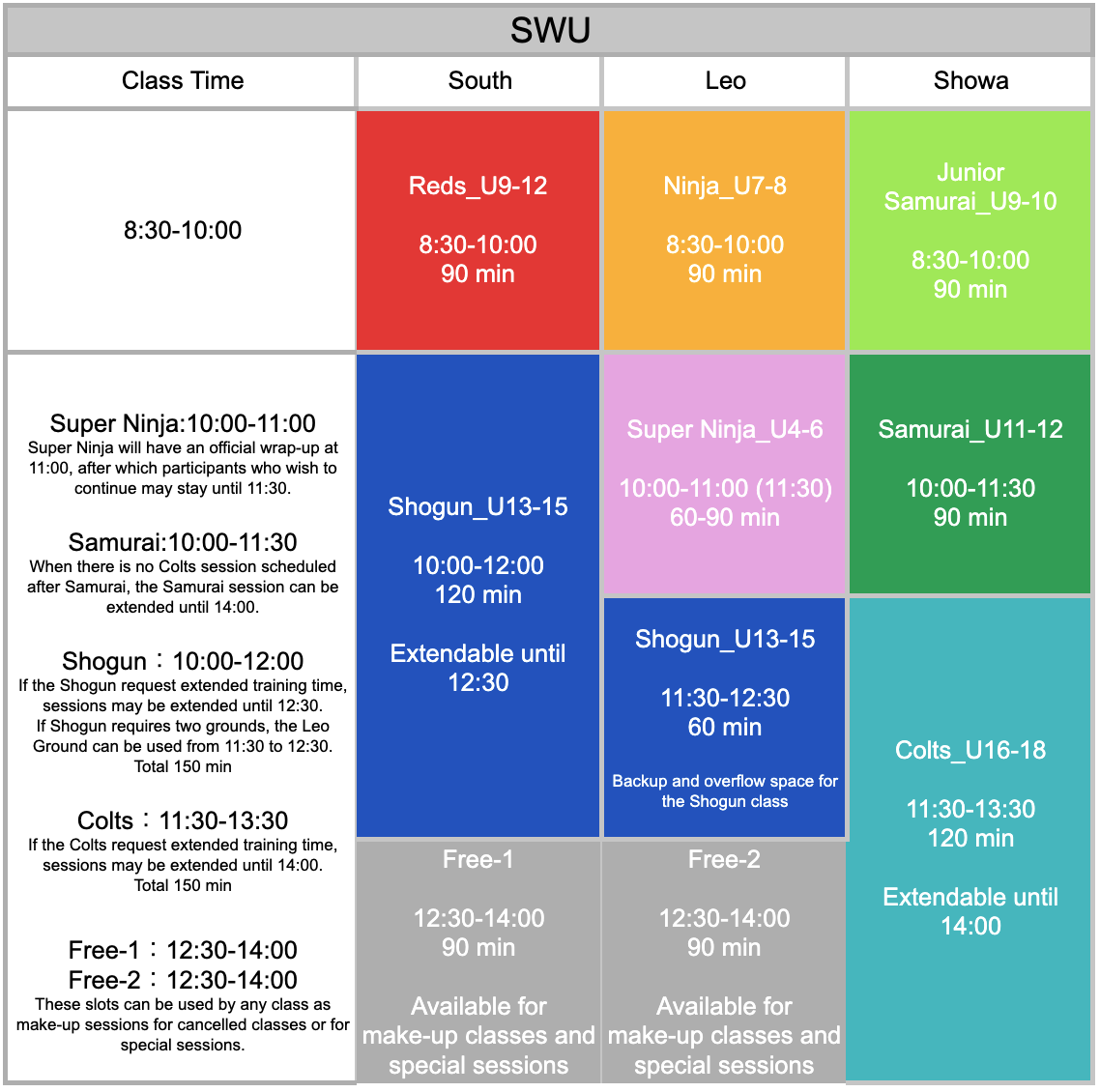Subsequent schedules will be finalised after official match dates are confirmed. Taking regular training days and away matches into consideration, we will adjust the overall activity schedule so that classes can be held:
